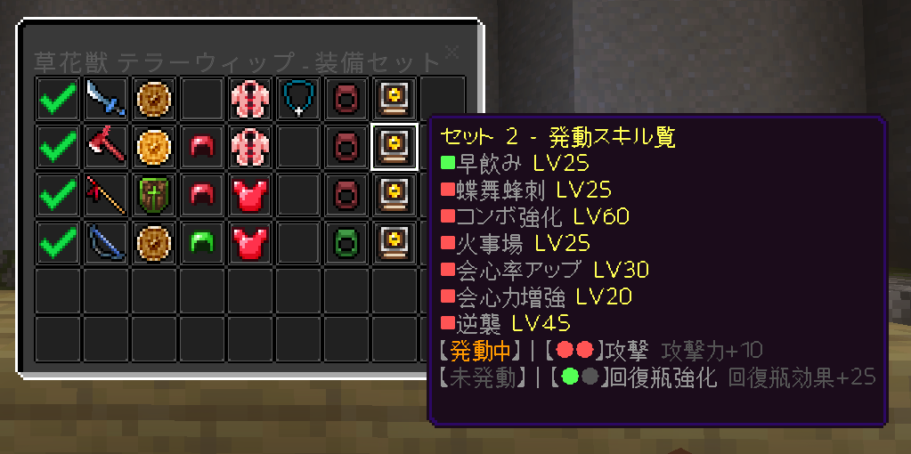 バニラの要素をほぼ使用しておらず、独自の装備システムを採用しており、装備には武具スキルと呼ばれるパッシブスキルが備わっております。オリジナルの装備を組み合わせる事で多彩な装備構成で戦う事ができます。