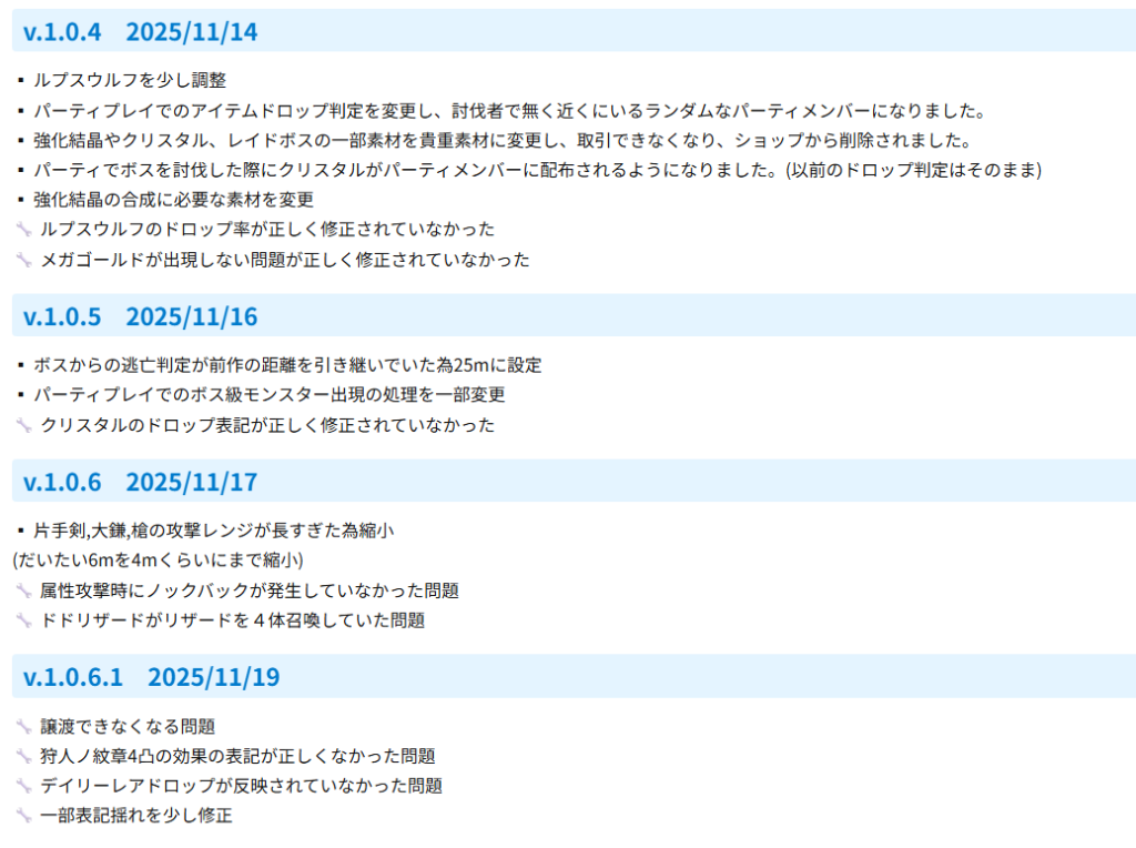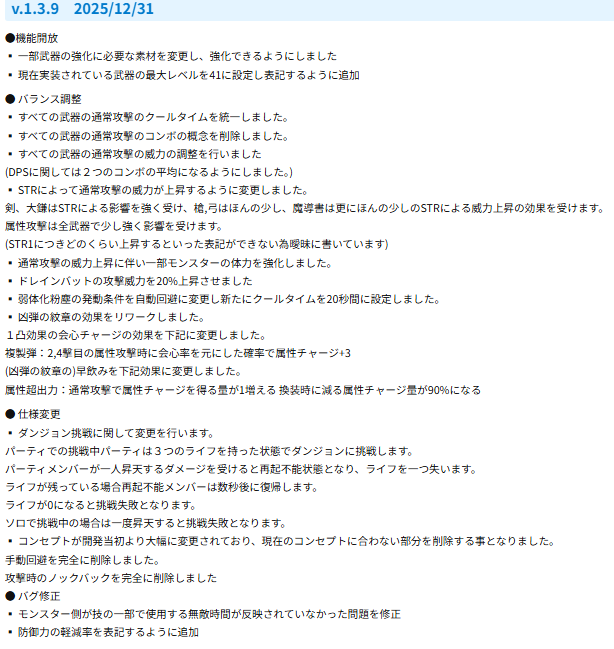 また、ナーフが多い点に関してはシンプルに実装時の効果が強すぎる状態で実装してしまっている結果であると感じている為、今後は慎重に行っていきたいと感じています。特に前作でのナーフしない調整の結果厄災装備と槍ぶっ壊れを引き起こしていたりするのでただただ強くしていくだけではナーフと変わらない結果となる為、今後もナーフをしない事はありませんが強くしすぎず弱くしすぎないような感じでの実装ができたらいいなと理想を掲げておきます。(多分無理)