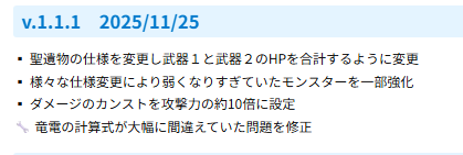 こちらのアップデートもかなりの問題児で現在のサブ武器の聖遺物HP固めの発端となったアップデートです。