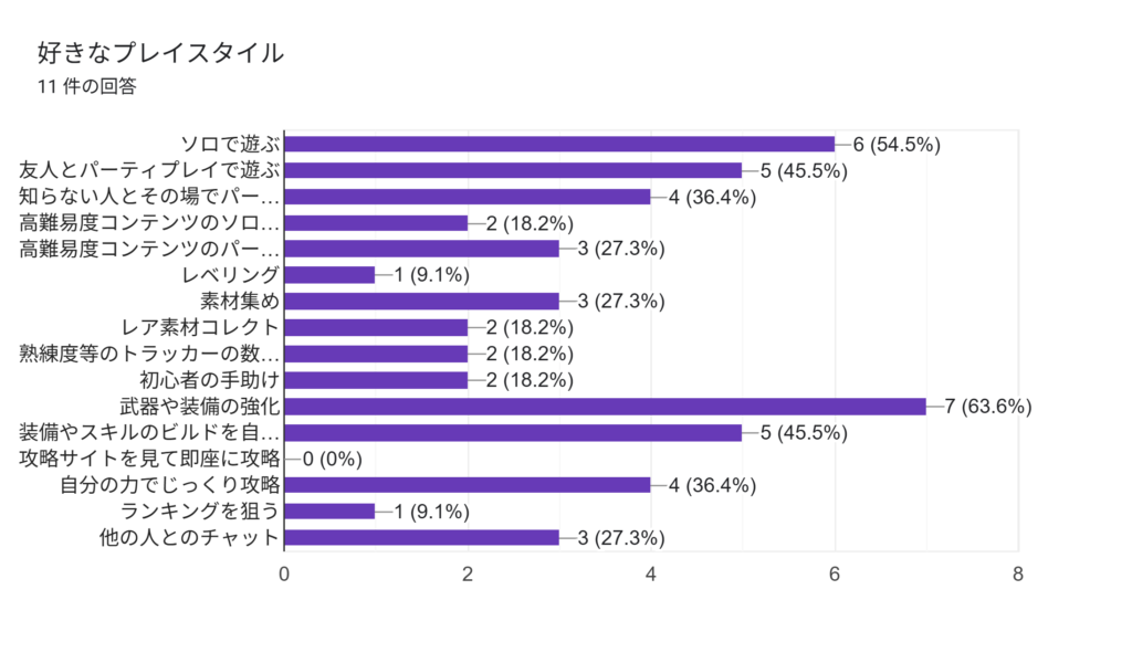 意外とソロプレイが多く、一番多いのは装備強化でした。